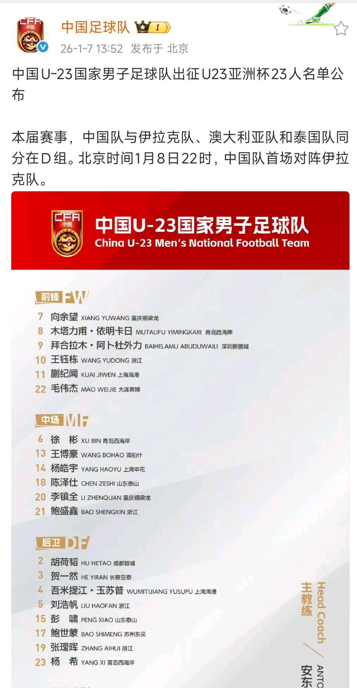 这份名单的出炉,意味着一切尘埃落定。根据亚足联官网在1月4日公布的信息,中国队提交了最终的23人报名名单。