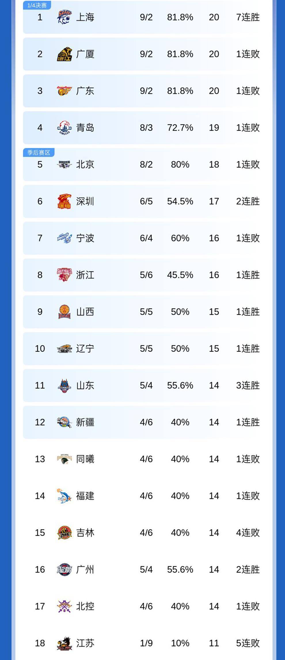 更刺激的是中间段。 深圳赢球后蹿到了第6,青岛输球暂列第4,后面还有一堆胜率差不多的球队在追。 现在的CBA,没有哪场球是稳赢的,16分的优势说没就没,八连胜的势头说断就断。 你说这是外援决定了比赛吧,上海队靠的又是全民皆兵。 你说领先多了就稳了吧,深圳和广东的例子就摆在眼前。